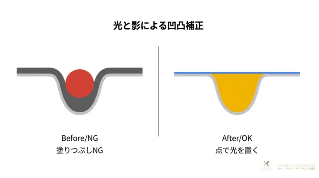 平坦(白色瘢痕、テカリ) 毛穴がなく、ビニールのようにツルツルしてインクを弾く。 専用のアイプライマーや硬めのワックス下地を使い、人工的な「ひっかかり」を作る。