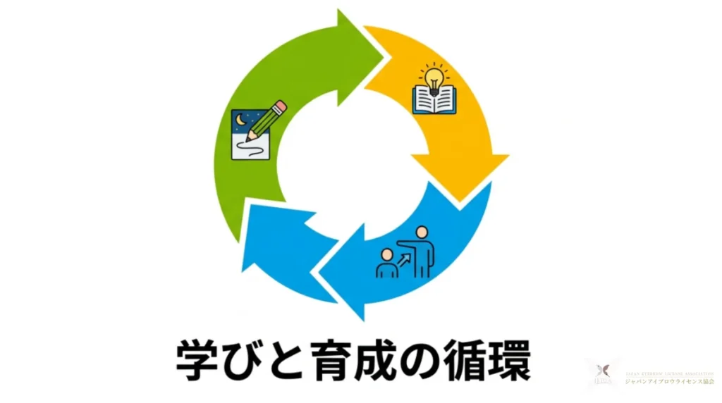 自身の施術が終わった後や、営業中の手の空いた時間に行われるのが、次世代のデザイナーを育てる「教育」です。公認アイブロウデザイナーは、自分の技術を独り占めするのではなく、サロン全体のクオリティを底上げするための「言語化された指導」を重視しています。