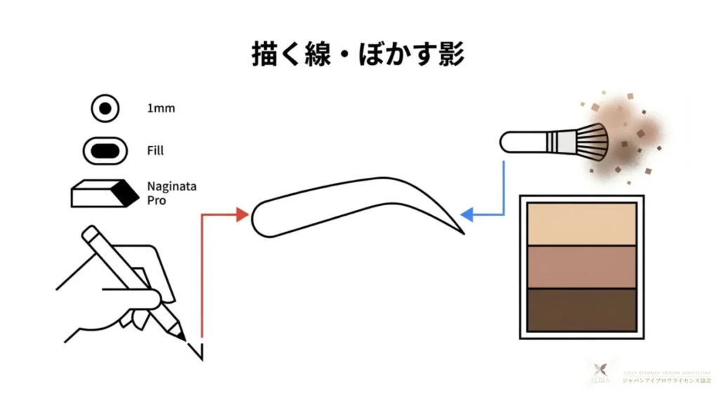- 「質感」はどうしたいか? → キリッと見せたいならペンシルメイン、優しく見せたいならパウダーメインで構成します。